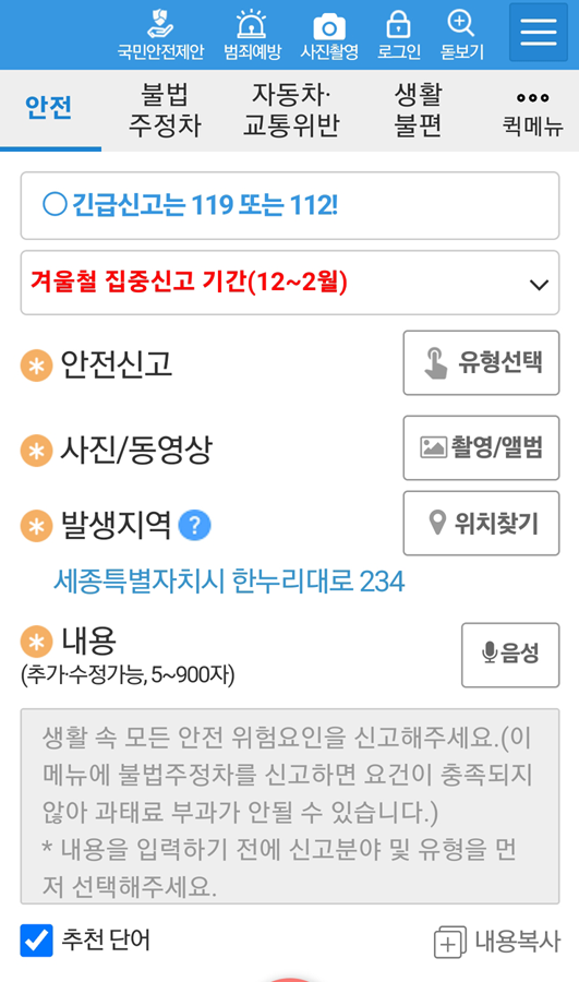 - 위치 및 신고 내용 작성