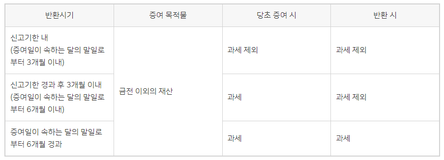 마지막으로 증여일이 속하는 달의 말일부터 6개월이 경과한 경우에는 증여에 대한 세금과 반환에 대한 세금을 내야 합니다. 따라서 증여세를 내지 않기 위해서는 증여세 신고기한 내에 돌려받아야 합니다.