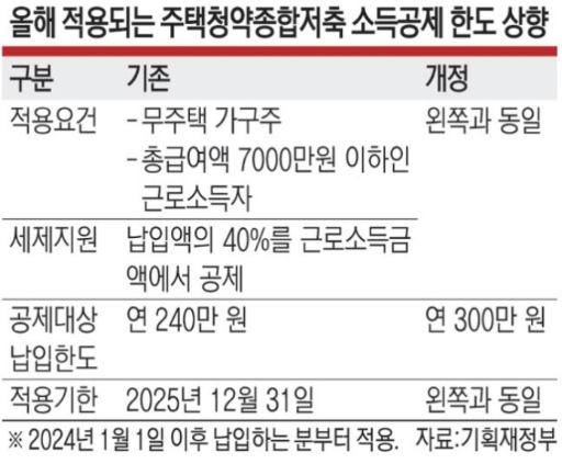 그리고 청약통장 월 납입금이 25만원으로 상향됨에 따라 연말정산 시 받을 수 있는 소득공제 범위가 기존 연 240만원에서 연 300만원으로 늘어나게 됩니다.