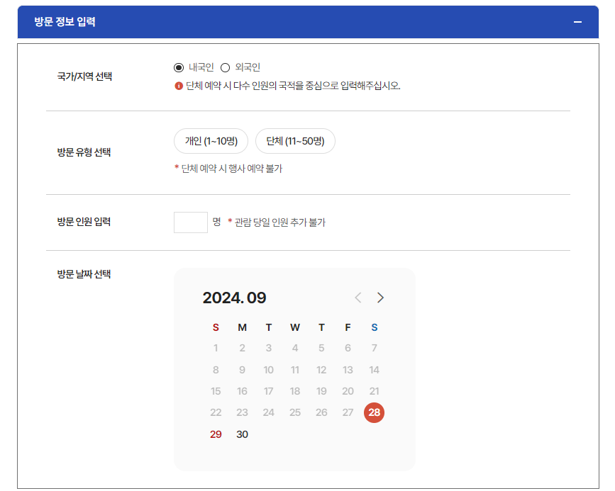 - 관람 날짜 및 시간 선택: 원하는 날짜와 시간대를 선택한 후 신청 인원을 입력합니다.