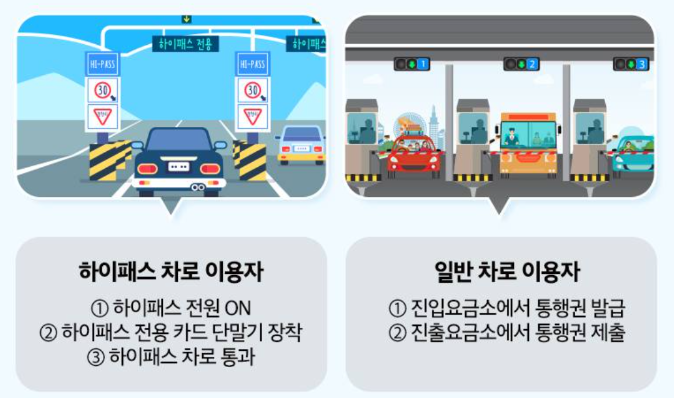 - 하이패스 이용자: 하이패스 전용단말기 장착 후 하이패스 차로 통과