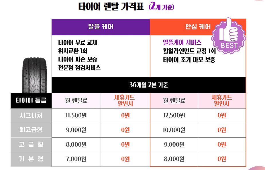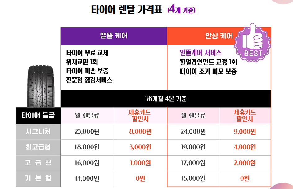 렌탈 서비스는 타이어 교체와 점검을 포함하기에 관리가 편리합니다. 타이어의 마모 상태, 공기압, 계절에 따른 교체 등을 신경 쓸 필요가 없어 장기 렌탈 이용 시 편리하게 사용할 수 있습니다.
