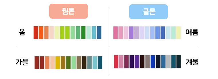 퍼스널 컬러는 웜톤과 쿨톤으로 구분되며, 각 톤은 다시 두 가지 계절별 색상으로 세분화됩니다.