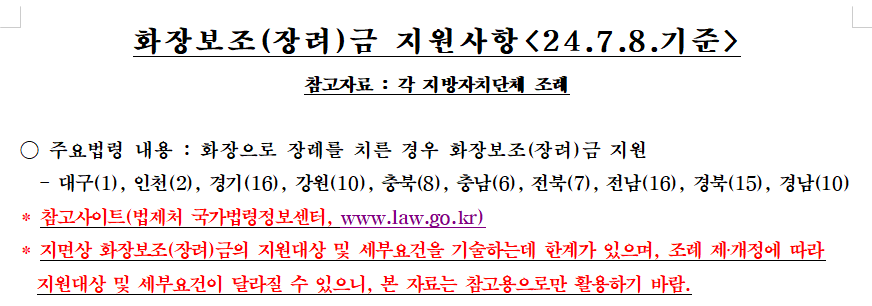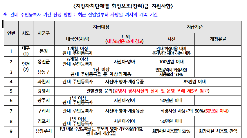 이러한 경우를 제외한 일반 유가족들이 지원 대상에 해당되며, 고인의 거주지가 화장장이 없는 지역이라면 타 지역의 화장시설을 이용할 때도 지원이 가능합니다.