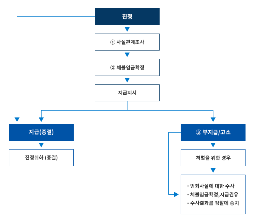 임금체불 신고가 접수되면 다음과 같은 절차로 처리됩니다.