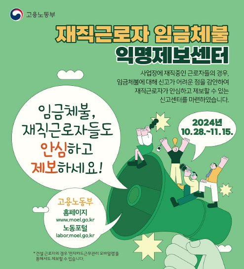 재직 중이라도 임금체불이 발생했다면 '재직근로자 임금체불 익명제보센터'에서 온라인으로 신고가 가능합니다.