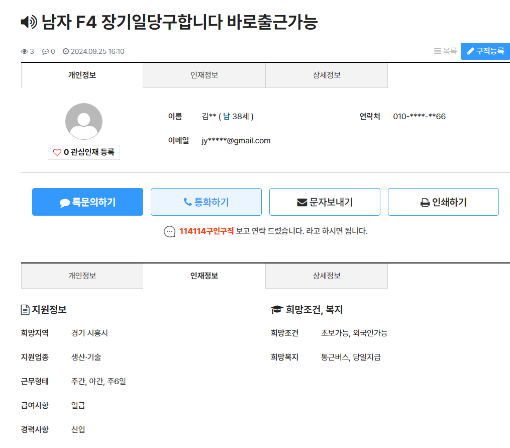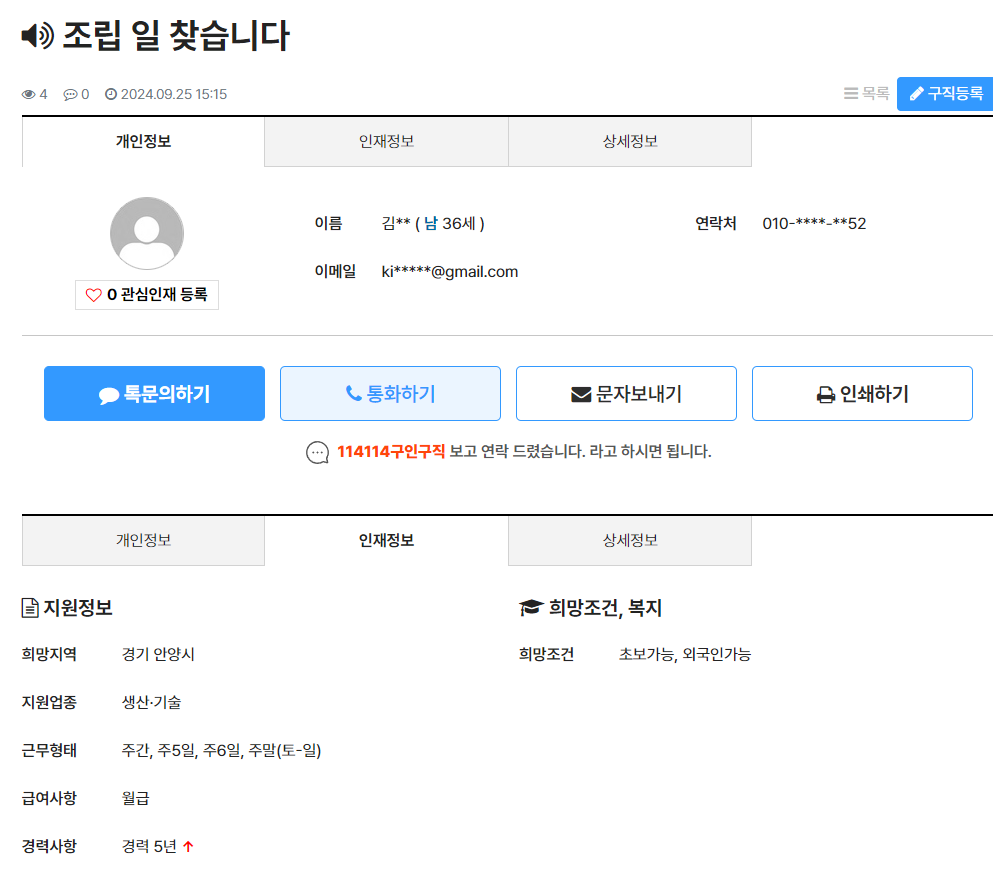 인재정보는 반대로 구인하는 사람이 본인의 조건에 맞는 직업을 구하기 위해 지원정보를 공개하는 곳이에요.