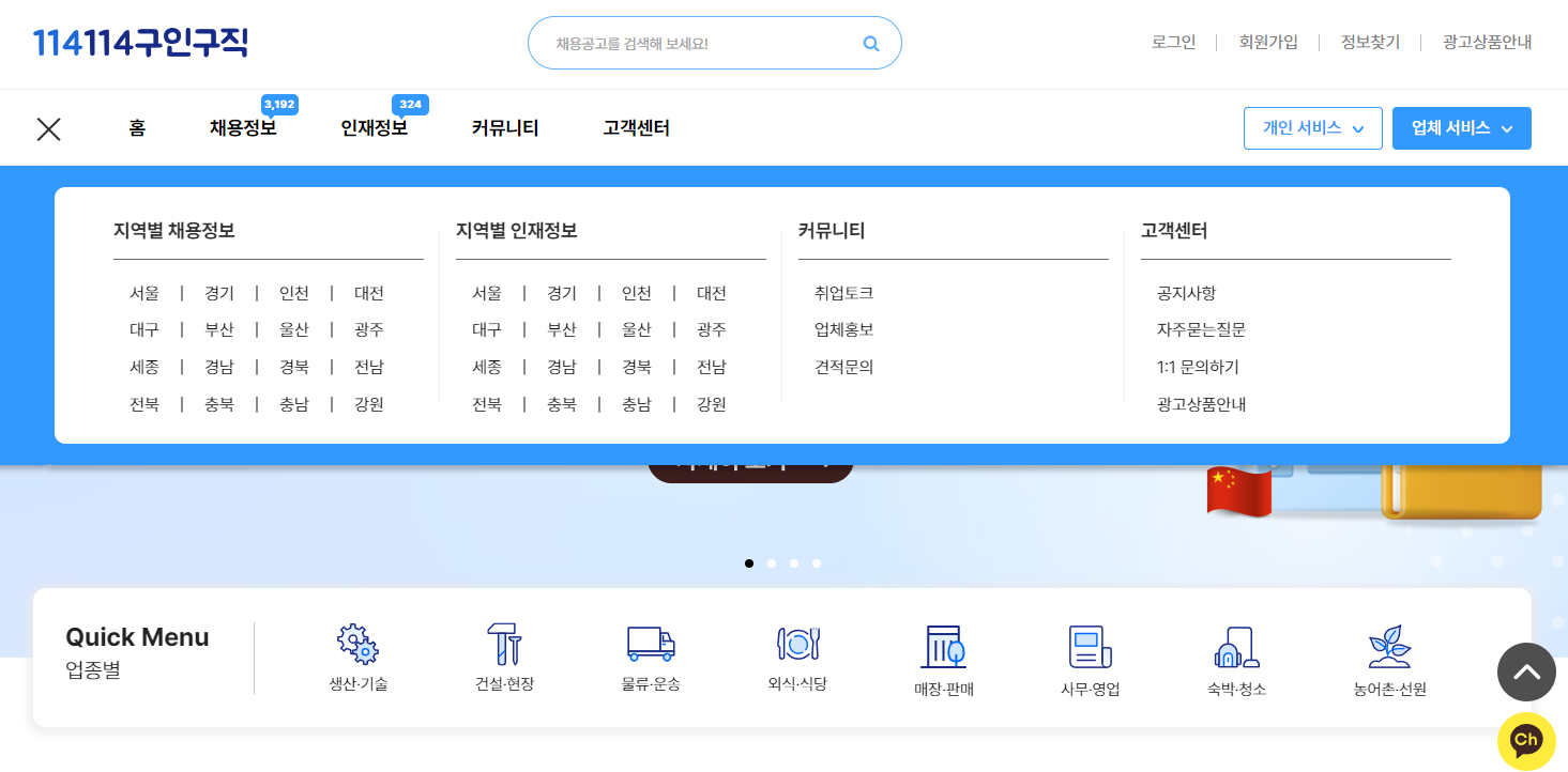 114114 구인구직 사이트 채용정보를 누르면 다양한 채용정보를 확인할 수 있습니다.
