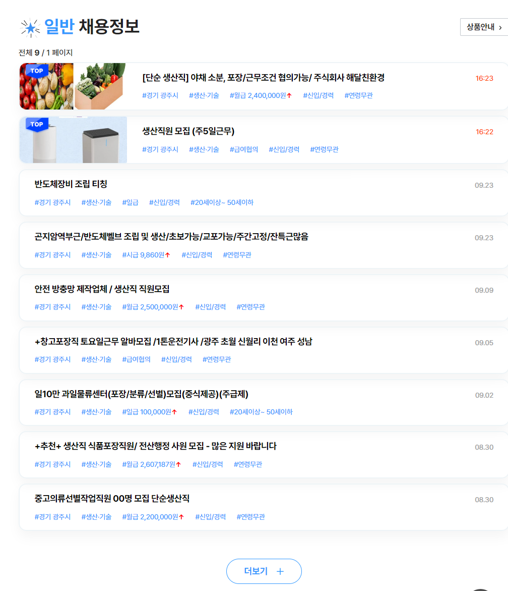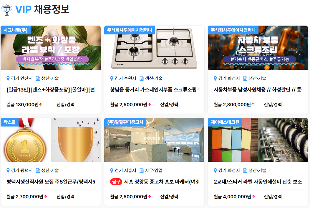 채용정보는 업체에서 광고를 통해 구인을 하고 있는 VIP채용정보와 일반 채용정보로 구분해서 확인할 수 있어요. 본인에게 맞는 구인구직 정보를 확인해보세요.