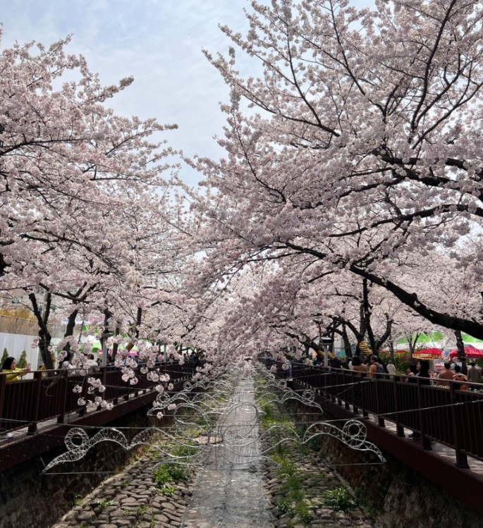 그 중에서도 로망스라는 드라마에서 나온 일명 '로망스다리'라고 불리는 여좌천에서는 1.5km 구간의 개천을 따라 늘어선 벚꽃나무가 하늘을 뒤덮는 절경을 이루는 모습을 볼 수 있습니다.