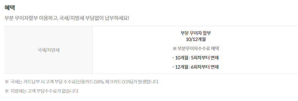 - 부분 무이자 할부 : 5~6개월 (3회차 부터 면제), 7~10개월 (4회차 이후 면제)
