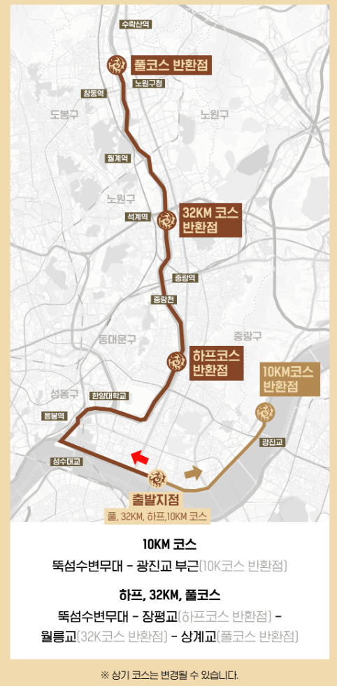 - 코스: 뚝섬수변무대 출발 → 중랑구, 노원구 반환