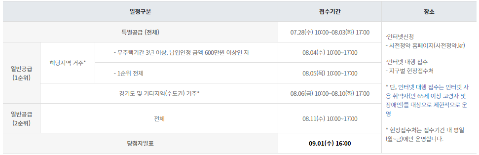 1차 특별공급 사전청약 일정은 아래와 같습니다. 7월 28일부터 8월 3일 오후 5시까지로 현재 진행중에 있습니다. 일반공급은 8월 4일~11일까지 신청을 받으며 당첨자 발표는 9월 1일 입니다. 거주기간과 자격 요건에 따라 일정이 다르므로 꼭 확인해보시기 바랍니다.