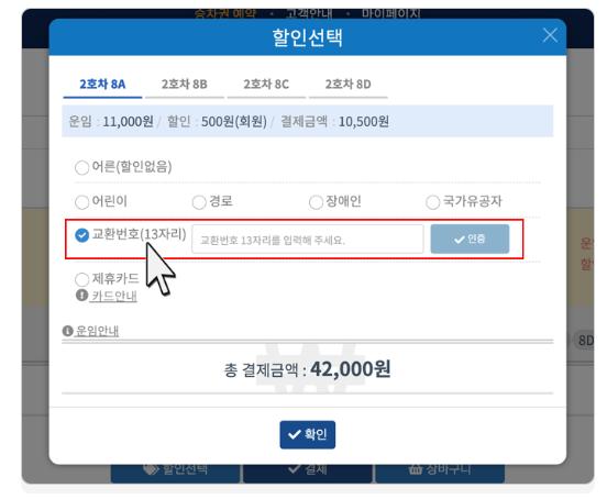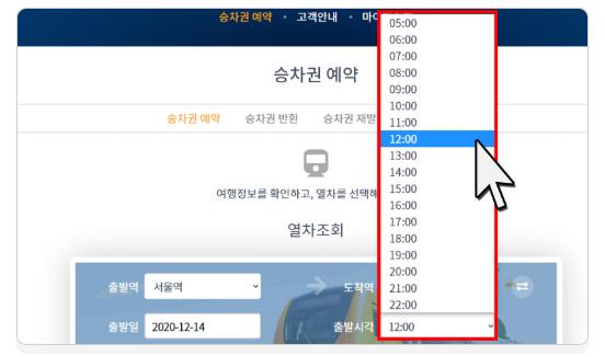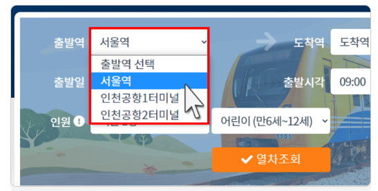 - 출발역, 도착역, 출발일, 열차시간, 인원 선택