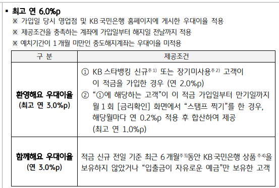 - 최근 6개월 동안 국민은행 상품 미보유 고객: 이 조건을 충족한 경우 연 3.0%포인트 우대금리를 제공