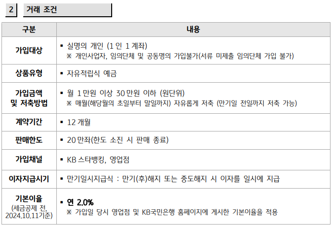 - KB스타뱅킹 신규 또는 장기 미사용 고객: 연 2.0%포인트 우대금리 제공